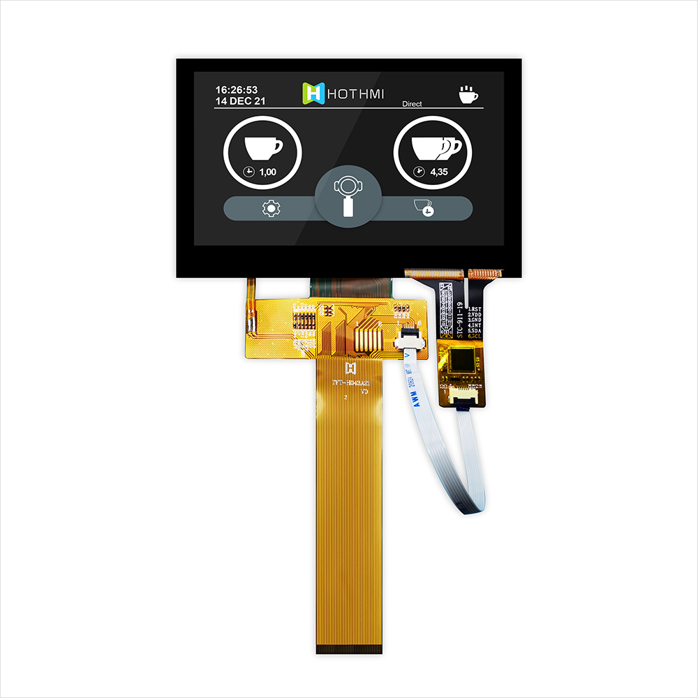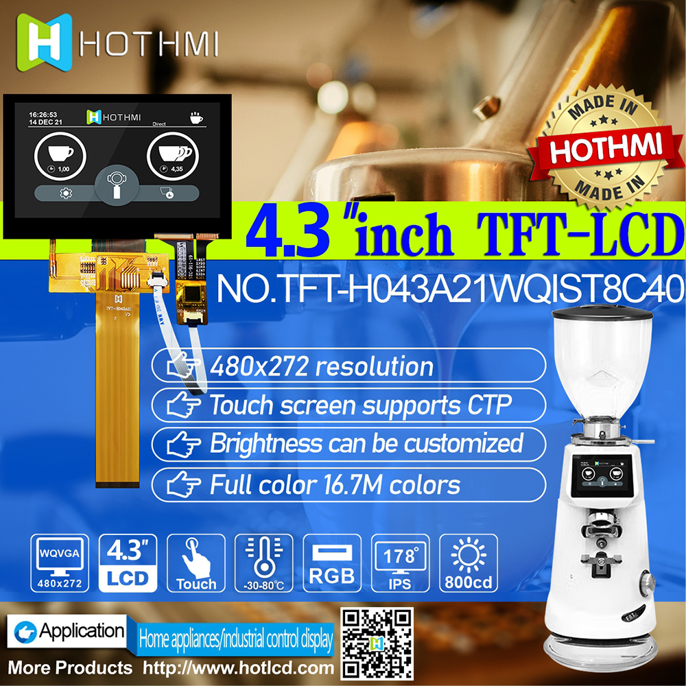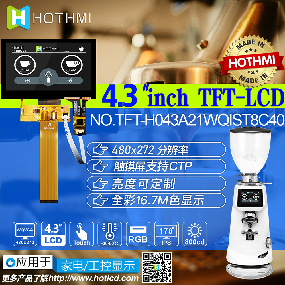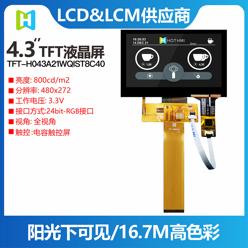 4.3 inch TFT color screen / 480*272 resolution / full viewing angle IPS process / RGB 24Bit / IIC interface / TFT-H043A21WQIST8C40 / used in coffee machines, home appliances, industrial control, medical display equipment, visible in sunlight