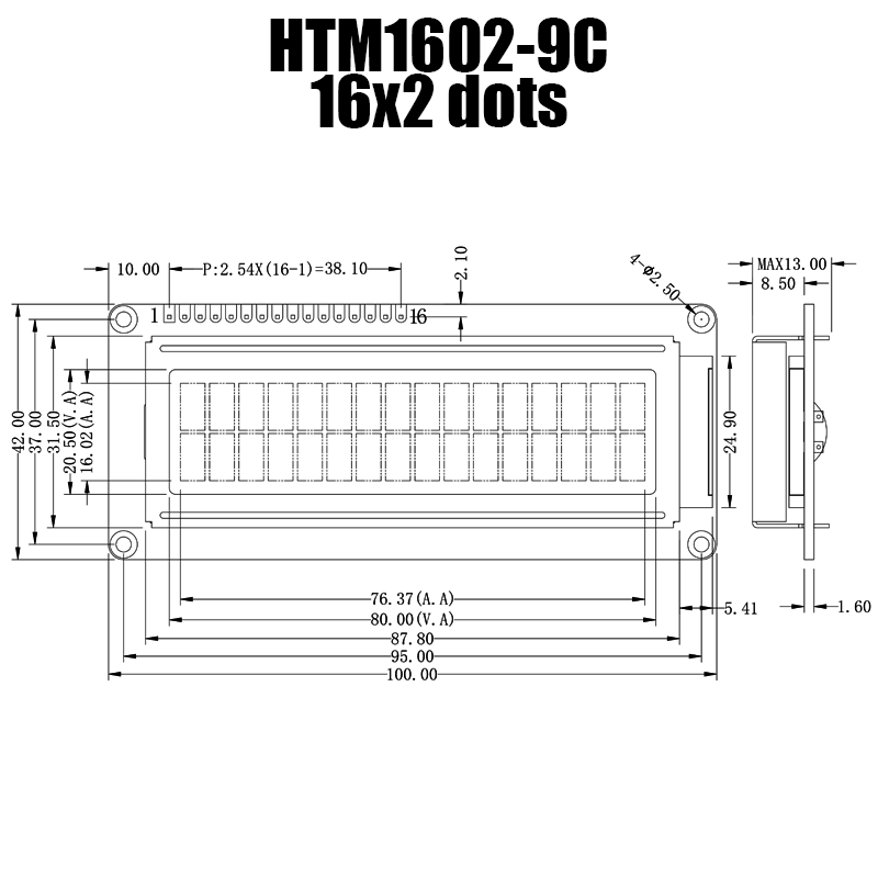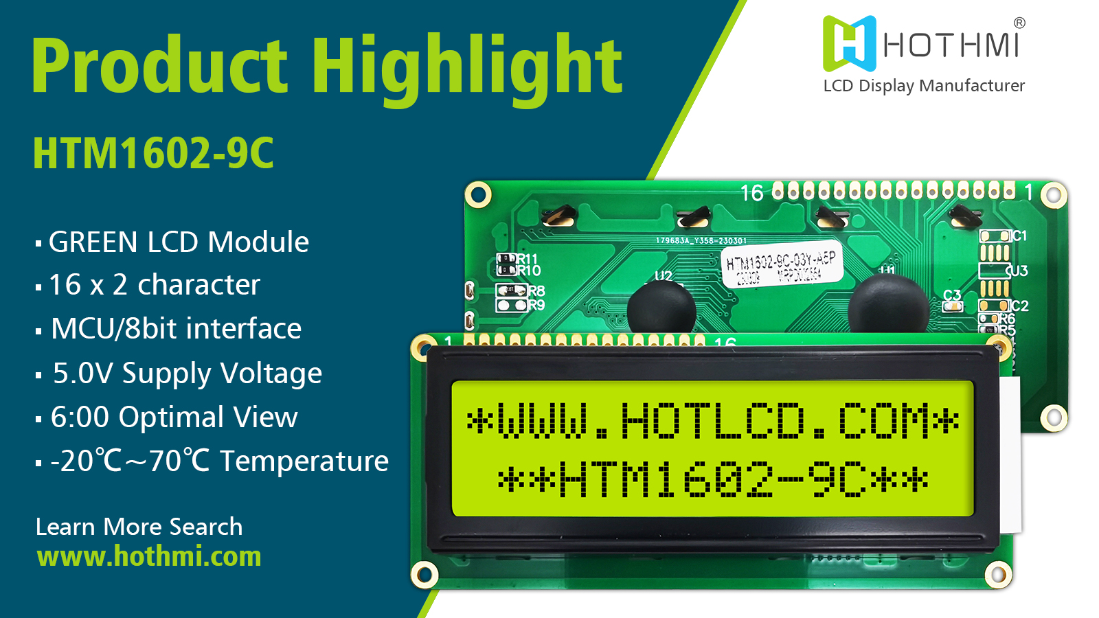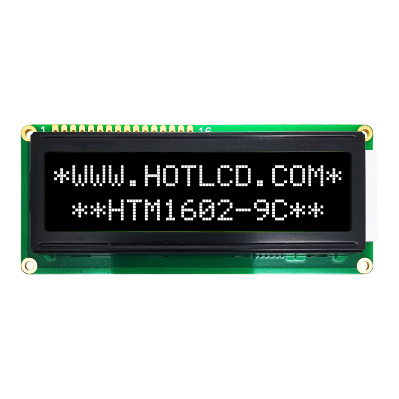 HTM1602-9C LCD Display Module 16 Character x 2 Lines with LED backlight provides various backlight color combinations, such as yellow-green, blue, white, amber, red. This LCD module without backlight is also available.