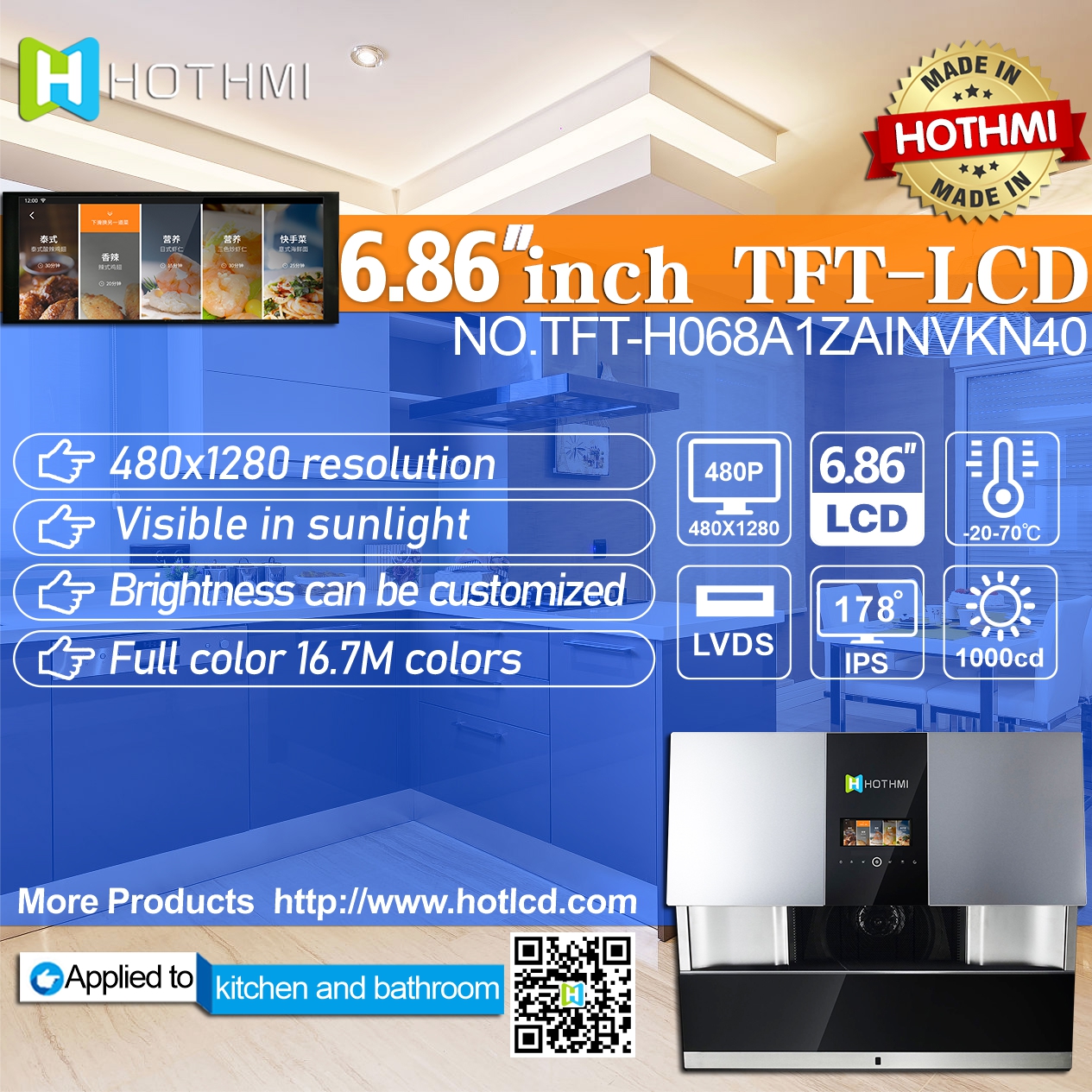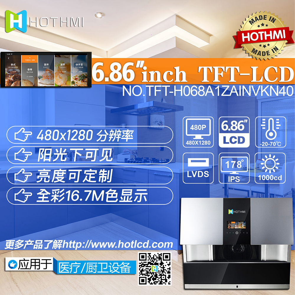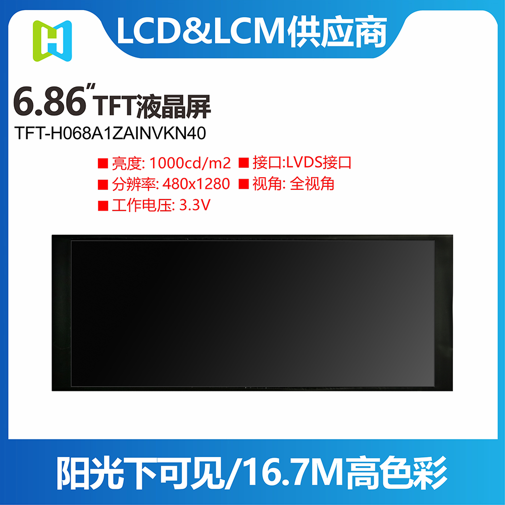 TFT-H068A1ZAINVKN40 是一款采用 IPS 面板技術(shù)的 6.86 英寸 TFT LCD 模塊。此 TFT-LCD 的分辨率為 480x1280 像素。TFT-H068A1ZAINVKN40模組內置NV3051F1驅動(dòng)IC,支持LVDS接口,對比度300(典型值),模組亮度1000尼特(典型值)。 H068A1采用IPS面板技術(shù),視角比TN玻璃更寬。左:80 / 右:80 / 上:80 / 下:80 度,色彩鮮艷,具有飽和度和自然度的高品質(zhì)畫(huà)面。 H068A1模組的驅動(dòng)電壓為3.3V,普通黑色/透光液晶,磨砂玻璃,屏幕縱橫比為8:3。該模塊的工作溫度為-20°C至+70°C,存儲溫度為-20°C至+70°C。