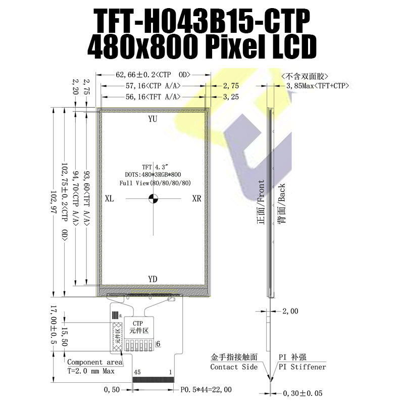 這是對具有電容式觸摸面板和 3:2 縱橫比的 TFT 顯示模塊的描述。 顯示屏尺寸為4.3英寸,分辨率為480×800像素。 它采用市場(chǎng)上流行的 IPS 面板,提供 80/80/80/80 度的寬視角。