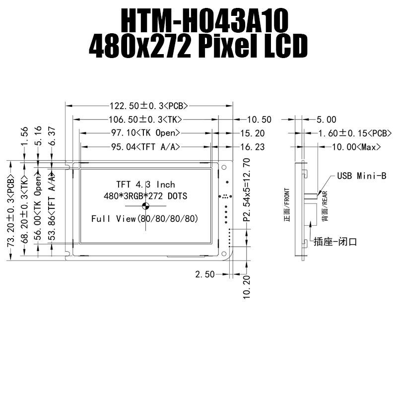 4.3英寸對角線(xiàn)彩色TFT屏,標配無(wú)觸摸/電阻觸摸/電容觸摸