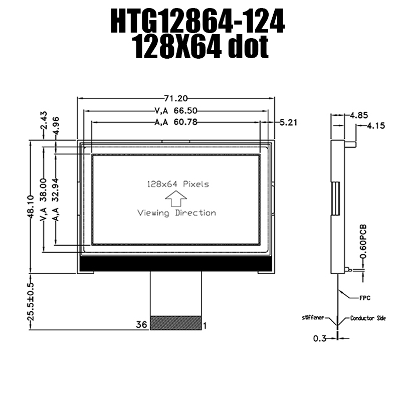 HTG12864-124 | 單色圖形COG | 128x64 點(diǎn) | 透反式液晶顯示器 | 側面白色背光| FSTN(+)正極顯示